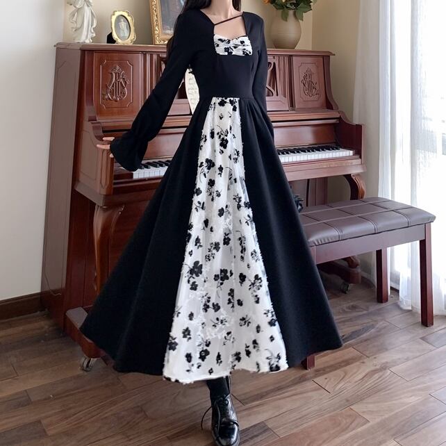 ワンピース レディース 送料無料 バイカラー スクエアネック 切り替え ストラップ アシンメトリー 花柄 レース フレアワンピース ロング丈 半袖 バイカラー ボリューム袖 Aライン 大人可愛い かわいい きれいめ 上品 エレガント 清楚 カジュアル こなれ感 抜け感 大人女子 おしゃれ お洒落 S M L XL 普段使い 重ね着 モテ 体型カバー 二の腕カバー ハイウエスト 脚長 春服 夏服 秋服 デート おでかけ 楽ちん ブラック