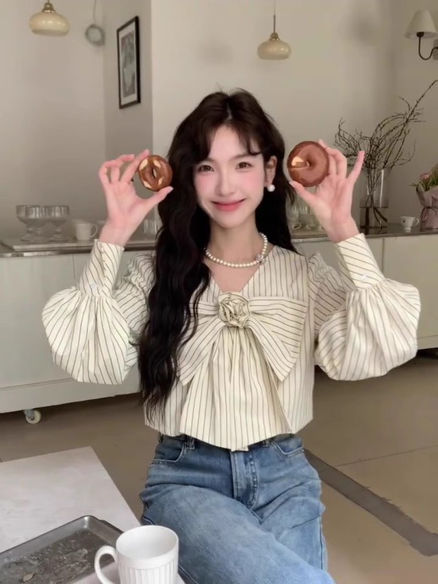 リボンブラウス レディース トップス ブラウス ゆったり ミディアム丈 長袖 ボリューム袖 ランタンスリーブ ロングカフス Vネック 襟なし フラワーコサージュ付き かわいい 大人可愛い きれいめ シンプル カジュアル 上品 おしゃれ こなれ感 個性的 存在感 キュート フェミニン ストライプ 総柄 縦縞 春 秋 ママ 女の子 学生 学校 通学 デート お出かけ レストラン 女子会 休日 ホテル ショッピング カフェ 韓国 オルチャン コーデ 体型カバー 普段使い S M L XL クリームイエロー