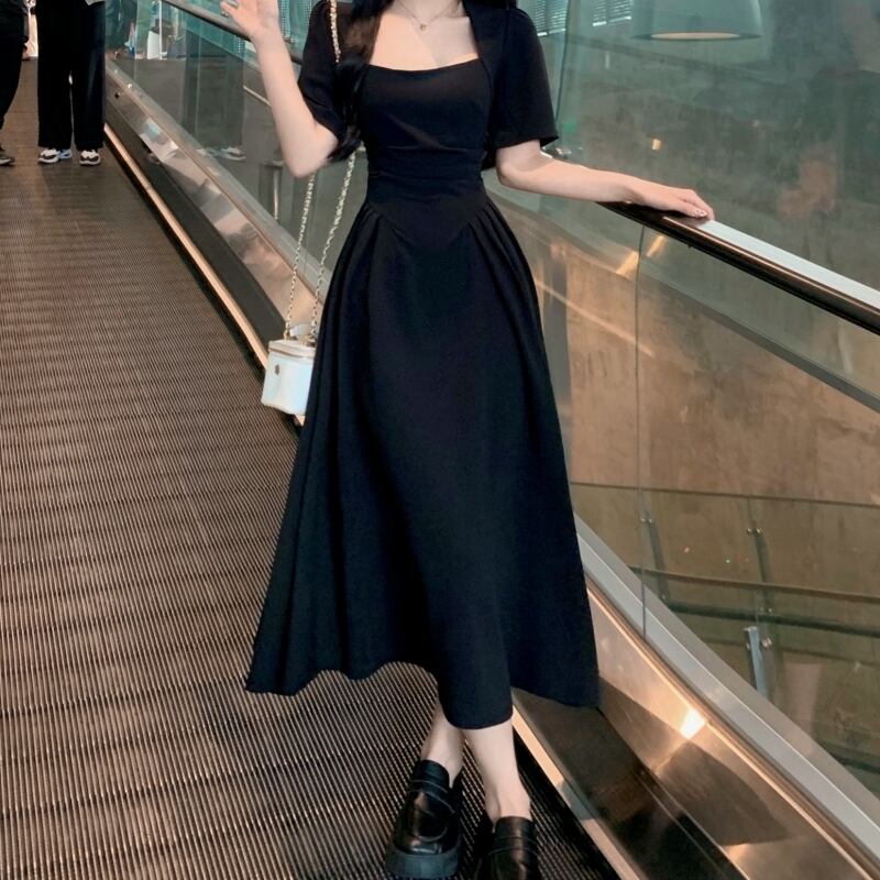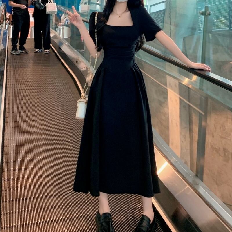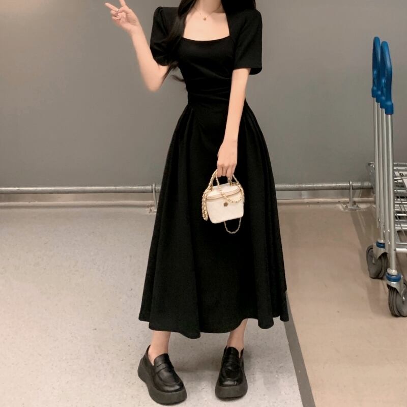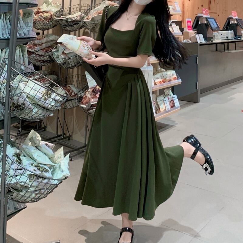ワンピース レディース 送料無料 2色 フレア ロング スクエアネック ギャザー プリーツ ハイウエスト 半袖 デコルテ ハイウエスト ウエストマーク 体型カバー 脚長 細見え 華奢見え スタイルアップ 二の腕カバー フェミニン きれいめ 上品 エレガント 大人女子 大人可愛い こなれ感 おしゃれ お洒落 カジュアル シンプル シック モダン 春服 夏服 おでかけ デート 普段使い 重ね着 着回し 30代 20代 10代 ブラック グリーン