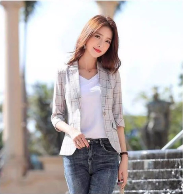 レディース ジャケット スーツ 上着 7分袖 スーツカラー タイト スリム ストレート ポケット ボタン かわいい 大人可愛い きれいめ シンプル カジュアル 上品 おしゃれ ガーリー ラブリー キュート チェック 春 夏 謝恩会 通勤 学生 学校 通学 デート お出かけ 女子会 ショッピング 韓国 コーデ 普段使い 着回し モテ トレンド 流行 インスタ映え S M L XL 2XL 3XL ベージュ