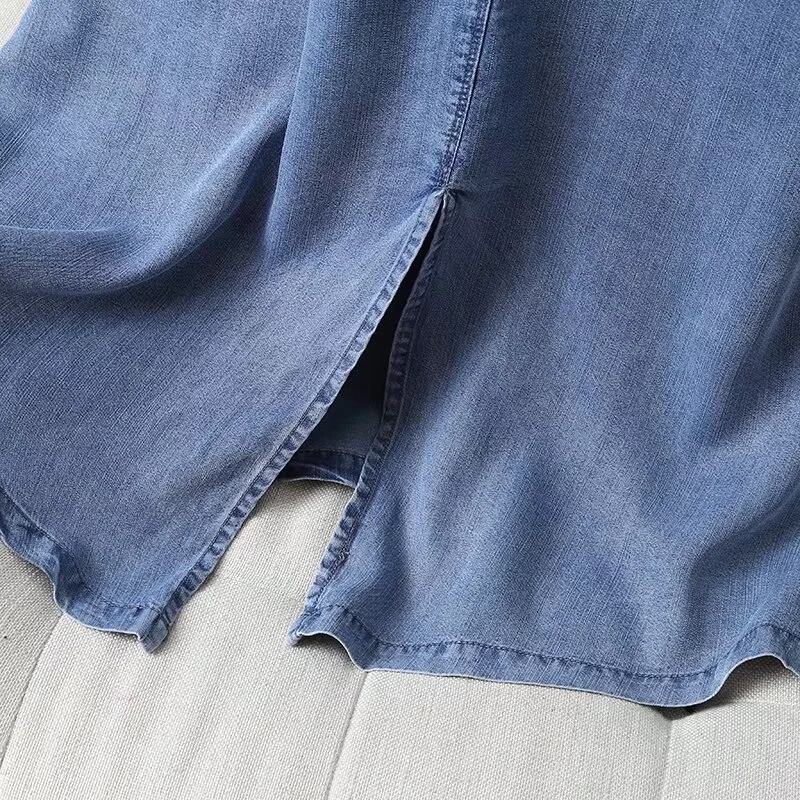 デニムワンピースの新定番!スクエアネックとバックリボンがポイントのフレアワンピース。シンプルなデザインながらも、スリットとAラインのシルエットが女性らしさを引き立てます。デニム素材ならではのカジュアルさと、ミモレ丈で上品さも両立した一着です。