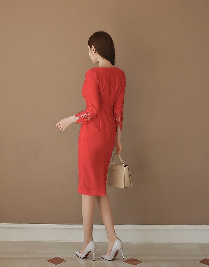 レディース ワンピース ドレス ミモレ 7分袖 ソリッドカラー タイト スリム 刺繍 バックスリット ファスナー かわいい 大人可愛い きれいめ シンプル カジュアル 上品 おしゃれ ガーリー エレガント ラブリー キュート 無地 春 夏 OL 通勤 デート お出かけ パーティー イベント レストラン 韓国 コーデ 脚長 普段使い 着回し モテ トレンド 流行 インスタ映え S M L XL ホワイト ブラック レッド