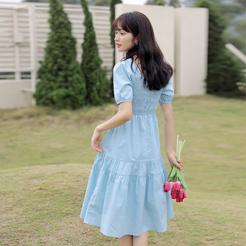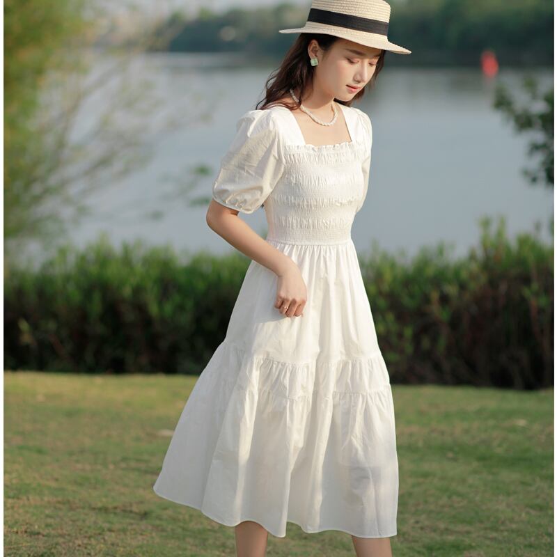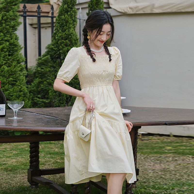 シャーリングワンピ レディース ワンピース Aライン ティアード風切替え 膝丈 膝下 ミモレ ミディアム丈 半袖 パフスリーブ スクエアネック 襟なし ノーカラー ハイウエスト 切り替えデザイン かわいい 大人可愛い きれいめ シンプル カジュアル 上品 おしゃれ キュート ロマンティック フェミニン 無地 春 夏 女の子 学生 学校 通学 デート お出かけ リゾート 旅行 レストラン 女子会 休日 バカンス ホテル カフェ 体型カバー 脚長 普段使い モテ 清楚 S M L ホワイト イエロー ブルー