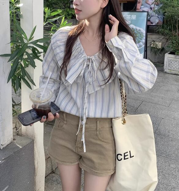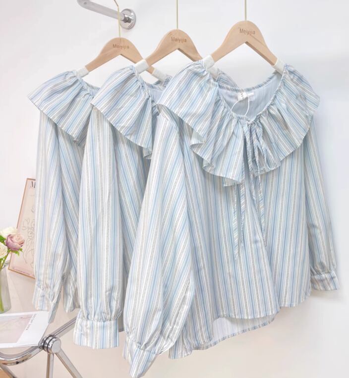 レディース トップス シャツ ブラウス 長袖 襟付き 大きめ襟 フリル リボン かわいい 大人可愛い おしゃれ ガーリー 存在感 ラブリー キュート ロマンティック フェミニン ストライプ 総柄 春 秋 ロングシーズン 学生 デート お出かけ 女子会 休日 ショッピング コンサート ライブ お花見 カフェ 双子 韓国 オルチャン コーデ プレゼント プチプラ 普段使い 着回し モテ 清楚 インスタ映え S M L XL 小さいサイズ 大きいサイズ 水色 ブルー 春カラー