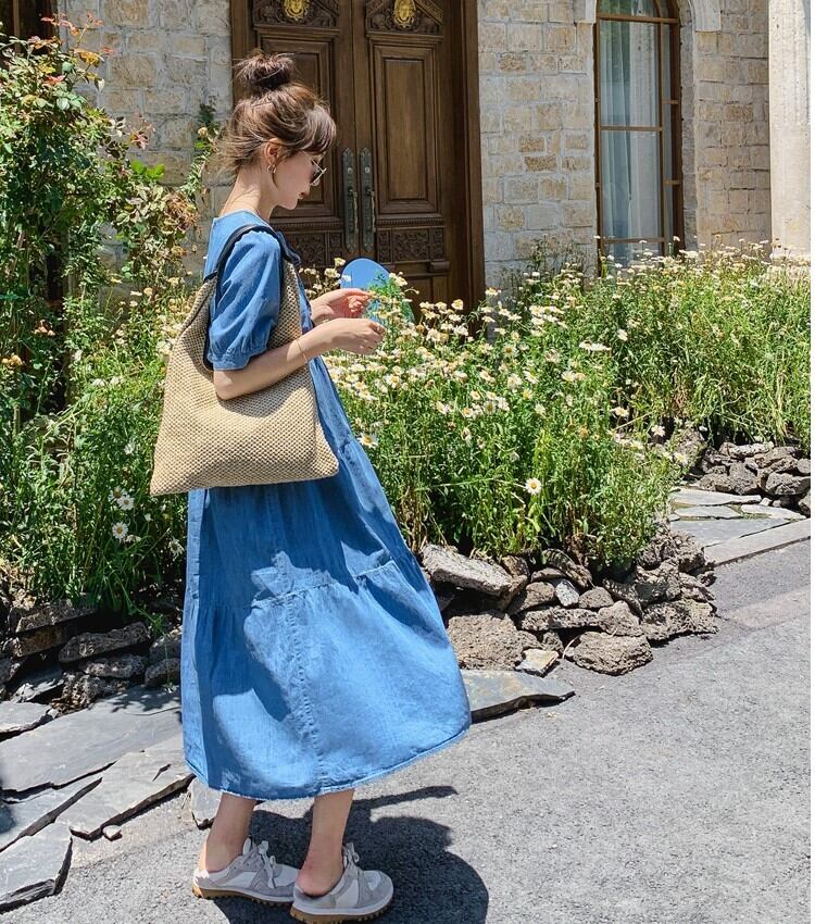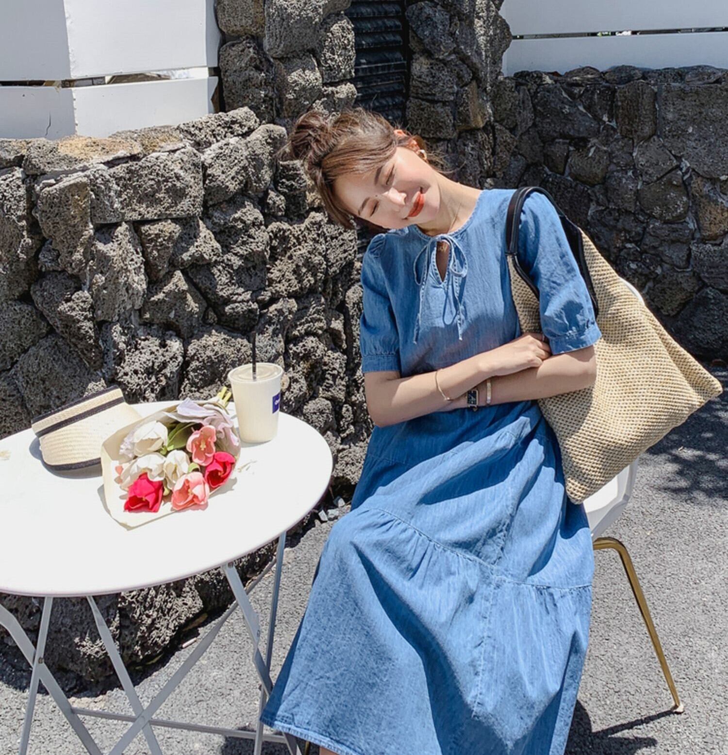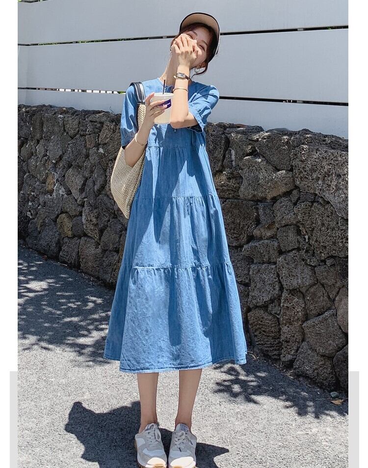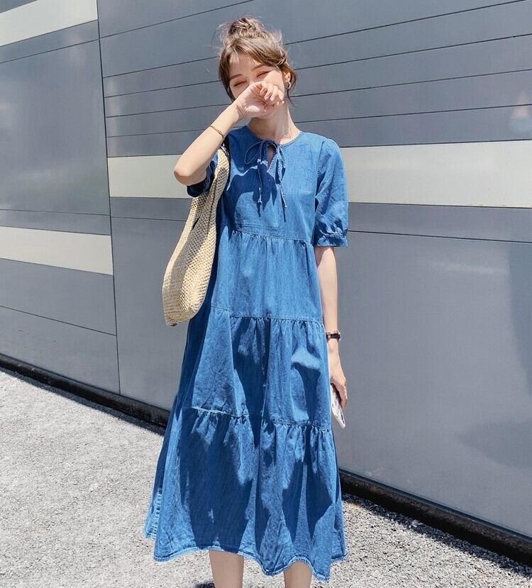 ティアードワンピ レディース ワンピース デニムワンピース ゆったり Aライン 膝下 ミモレ ミディアム丈 半袖 5分袖 パフスリーブ クルーネック 襟なし リボン デニム ブルーデニム 薄手 かわいい 大人可愛い シンプル カジュアル 上品 おしゃれ レトロ こなれ感 ナチュラル 無地 春 夏 ママ マタニティ 女の子 学生 学校 通学 デート お出かけ リゾート 旅行 女子会 休日 バカンス ショッピング カフェ 韓国 オルチャン コーデ 楽ちん 体型カバー 普段使い 清楚 S M L 青 ブルー