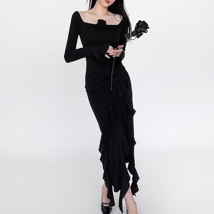 ドレス ワンピース パーティー 演奏会 発表会 ステージ 舞台 ダンス 衣装 ロング 長袖 スクエアネック スリム 細身 フリル スリット 伸縮性 サイドスリット 可愛い きれいめ シンプル カジュアル 大人可愛い 上品 おしゃれ かっこいい レトロ エキゾチック クール モード エレガント モダン 主役級 存在感 とろみ感 抜け感 クラシック ゴージャス エレガント セクシー 華やか ナチュラル フラワー ローズ イベント 二の腕カバー 美脚 脚長 高見え 格上げ ラウンジ クラブ S M L ブラック
