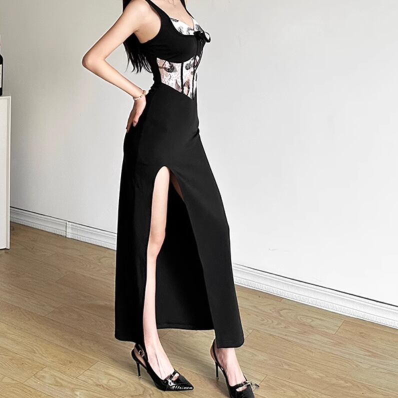 レディース スカート ワンピース ドレス ロングスカート ロング 袖なし ノースリーブ 襟なし スリム 細身 切り替え スマート リボン スリット サイドスリット 異国風 かわいい 大人可愛い きれいめ シンプル カジュアル 上品 おしゃれ かっこいい レトロ アジアン こなれ感 ラフ ガーリー ルーズ 個性的 クール モード系 エレガント モダン 主役級 存在感 とろみ感 抜け感 ラブリー キュート ロマンティック パーティー イベント コーデ 美脚 脚長 モテ インスタ映え S M L ブラック