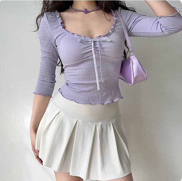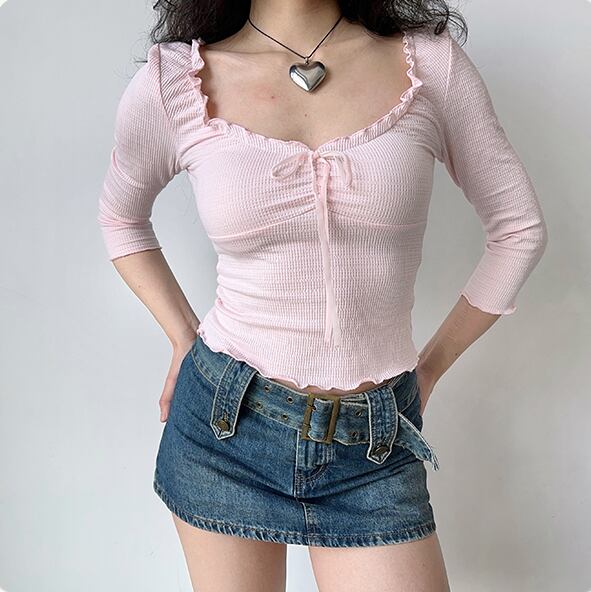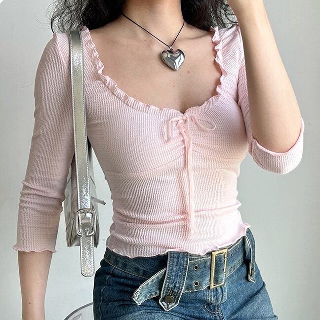 レディース トップス Tシャツ ショート 5分袖 キャミソール Uネック タイト スリム 細身 ストレート フリル リボン ワッフル かわいい 大人可愛い きれいめ シンプル カジュアル 上品 おしゃれ ガーリー ラブリー キュート 無地 春 夏 通勤 学生 学校 デート お出かけ 旅行 女子会 ショッピング 韓国 コーデ 普段使い 着回し モテ トレンド 流行 インスタ映え S M L XL ブラック ベージュ ピンク ライトブルー パープル