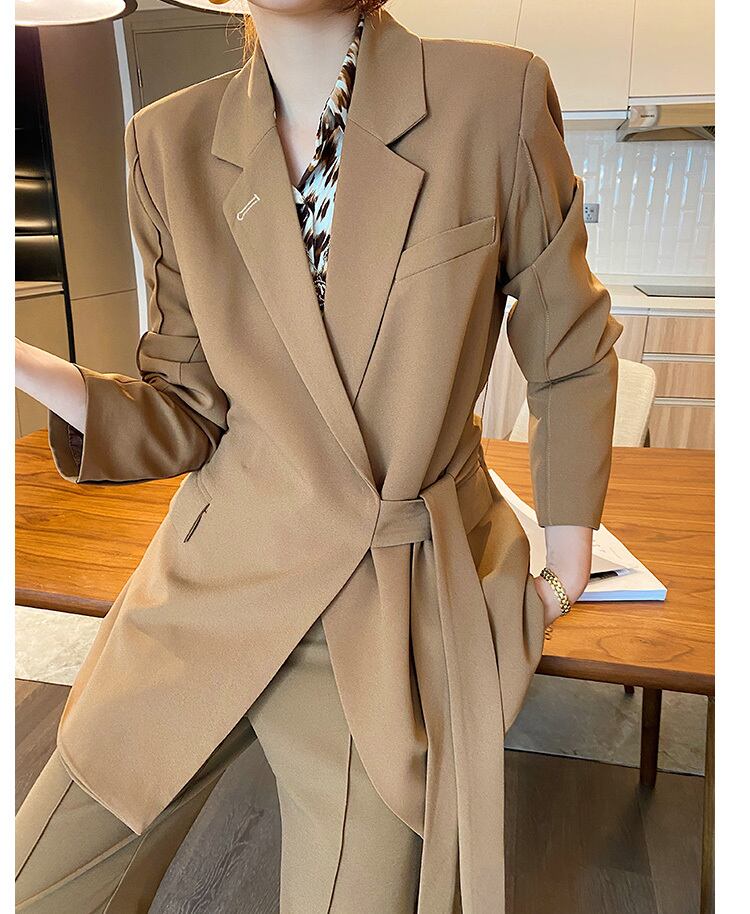 ブラウンの上着には、上品な色合いとクールな印象が漂う。さりげない抜け感がありながらも、美しいラインが女性らしさを引き立てます。お洒落でこなれ感のある装いを求める方には、是非ご検討いただきたいアイテムです。