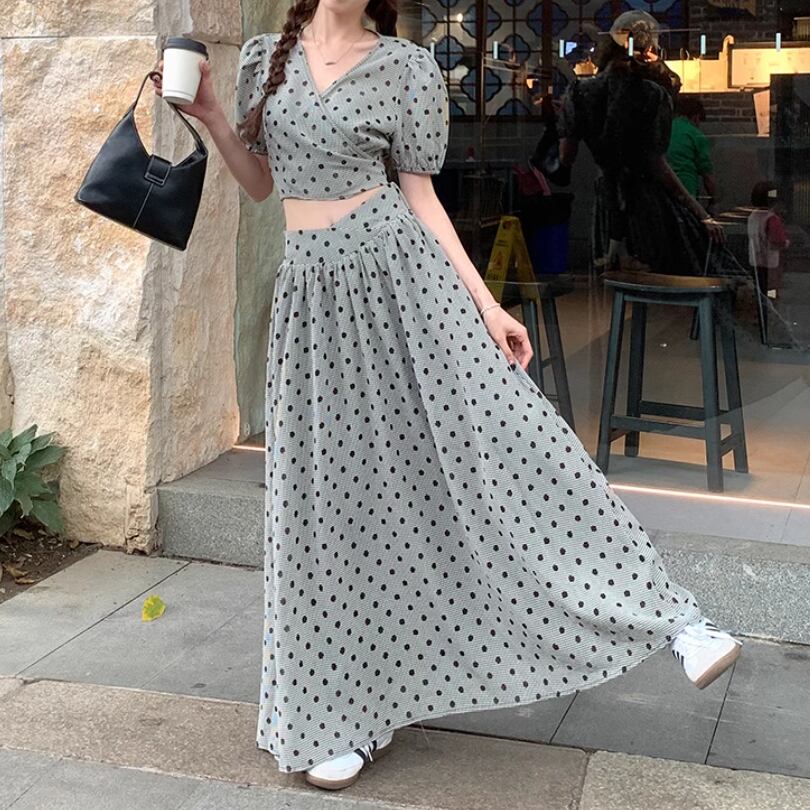 2点セット レディース スカート トップス セットアップ ロングスカート 半袖 パフスリーブ Vネック 襟なし Aライン フリル ハイウエスト かわいい 大人可愛い きれいめ カジュアル 上品 おしゃれ かっこいい レトロ こなれ感 ラフ ガーリー ルーズ 個性的 クール モード系 エレガント モダン 主役級 存在感 とろみ感 抜け感 ラブリー キュート ロマンティック ドット柄 水玉 夏 デート お出かけ リゾート 休日 バカンス ショッピング コーデ モテ トレンド インスタ映え XS S M L