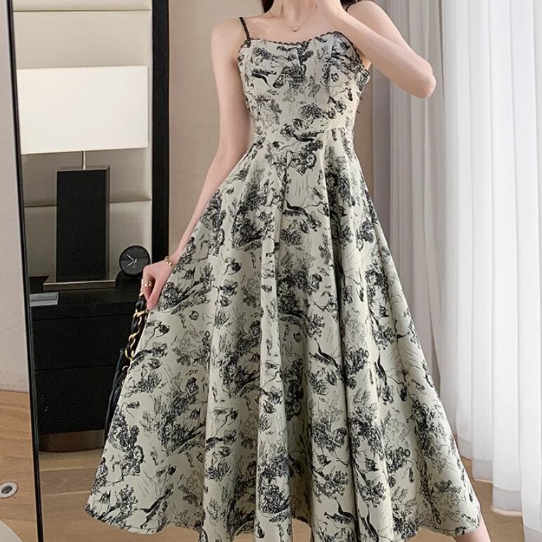 エレガントな水墨画花柄が印象的なサスペンダードレス