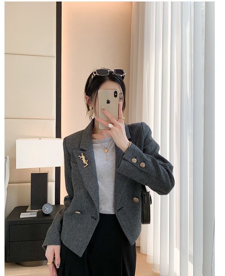 このジャケットは、ショート丈でクールな印象を与える一枚です。大人女子にぴったりのデザインで、主役級の存在感を演出します。シンプルで上品な襟付きと前開きが、おしゃれなレトロ感を引き立てます。フェミニンなスタイルからモード系まで、幅広いコーディネートに対応し、どんなシーンでも活躍するでしょう。