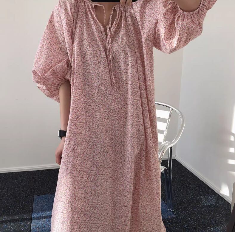 レディース ワンピース ロング 7分袖 パフスリーブ Vネック リボン 薄手 かわいい 大人可愛い おしゃれ アジアン エスニック ラフ ガーリー 個性的 キュート カントリー ナチュラル リラックス 花柄 フラワー 春 夏 秋 ロングシーズン 学生 デート お出かけ 女子会 休日 ショッピング コンサート ライブ お花見 カフェ 楽ちん 体型カバー プチプラ 普段使い 着回し モテ インスタ映え ゆったり ゆる フリーサイズ グリーン レッド 緑 ベーシックカラー 春カラー